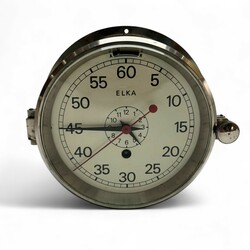 | Omschrijving | Een 20e eeuwse scheepsklok, Elka. Verchroomde bronzen behuizing, witte wijzerplaat met Arabische cijferaanduiding. De buitenring toont de seconden/minuten (0–60), met een kleine urenwijzer in het midden. Met sleutel. |