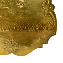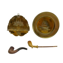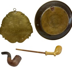 | Omschrijving | Een 20e eeuws messing wandbord met voorstelling van een driemaster, gemerkt ‘Friesche Koper Kunst’. Met daarbij een messing pijpenrekje met voorstelling van de Waterpoort, Sneek, tevens gemerkt ‘Friesche Koper Kunst’ en gesigneerd Jan Dijkstra (1928-2005). Met twee pijpen. |