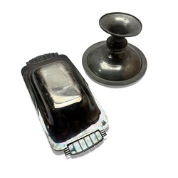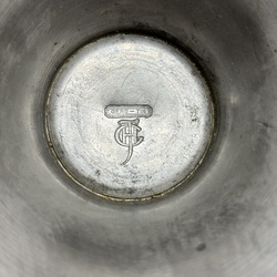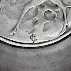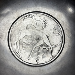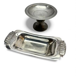 | Omschrijving | Een GERO tinnen tazza op hoge ronde voet. Schaal gedecoreerd met een gestilleerd hert. Ontwerp en gesigneerd Chris .J. van der Hoef (1875-1933). Hierbij een Art Deco langwerpige verzilverde broodschaal. Model 1234. Ontwerp van Georg Nilsson (1888-1975) voor GERO . Ca. 1935. |
