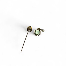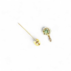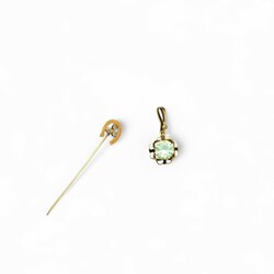 | Omschrijving | Een 20e eeuwse 14 karaats (585/1000) geelgouden hanger. Rond model, bloemvormig, centraal bezet met een grote, groene, gefacetteerde steen. Met daarbij een antieke 19e eeuwse 14 karaats (585/1000) geelgouden dasspeld in de vorm van een hoefijzer met klaverblad, bezet met drie briljantjes. |