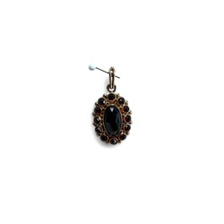 | Omschrijving | Een 20e eeuwse 14 karaats (585/1000) geelgouden hanger, bezet met gefacetteerde granaat. Gemerkt met eikenblaadje en meesterteken. |