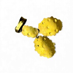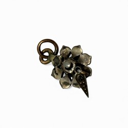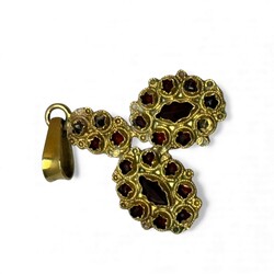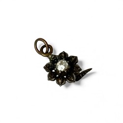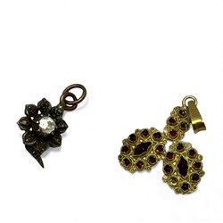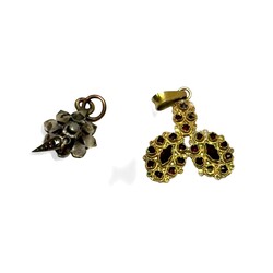 | Omschrijving | Lot van twee hangers, één gemaakt van 19e eeuwse 14 karaats (585/1000) gouden schakels van een bootjescollier, bezet met granaat. En één tweede gehalte (835/1000) zilveren hanger, bloemvormig, bezet met roosgeslepen diamant. |