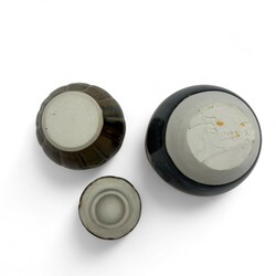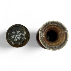 | Omschrijving | Een 20e eeuws keramieken dekselpotje met bruin glazuur, aan de onderzijde gemerkt ‘Budget drakebord’, door Han Boerrigter (Nijmegen 1935 - Leeuwarden 2023). Met daarbij een monochroom vaasje, gesigneerd Han Boerrigter. |