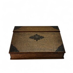 | Omschrijving | Een vroeg 20e eeuwse eikenhouten schrijfkist met metalen ornamenten, Jugendstil. |