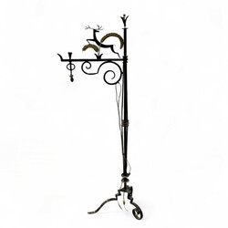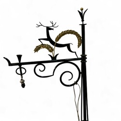 | Omschrijving | Een Franse jaren ‘30 art deco smeedijzeren staande lamp, drie pootjes, bekroond met een hert en twee korenschoven. |