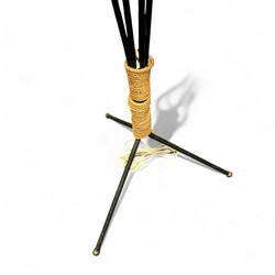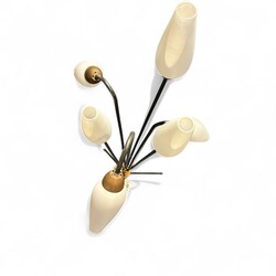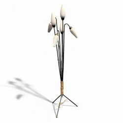 | Omschrijving | Een jaren ‘50 vloerlamp, metalen frame met vijf glazen kapjes. |