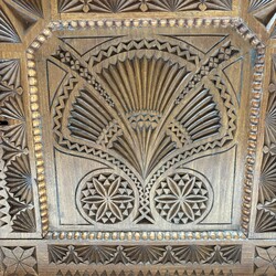 | Omschrijving | Een vroeg 20e eeuws Fries kerfsnede wandkastje, rijk gestoken, met deurtje en facet geslepen spiegel |