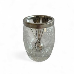 | Omschrijving | Een 20e eeuws lepelvaasje met verzilverde rand, gevuld met zes tweede gehalte (835/1000) zilveren theelepels, gemerkt Begeer, Utrecht. Met daarbij een kristallen dekselpotje, 19e eeuws, met tweede gehalte (835/1000) zilveren knop met parelrand. |