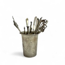 | Omschrijving | Een 20e eeuws tweede gehalte (835/1000) zilveren lepelvaasje, zonder inscriptie. Aan de onderzijde gemerkt Voorschoten. Gevuld met diverse zilveren en verzilverde theelepels, o.a. souvenirlepels en een set Amerikaanse lepeltjes, gemerkt ‘Frank E. Davis’. |