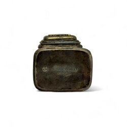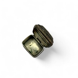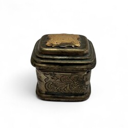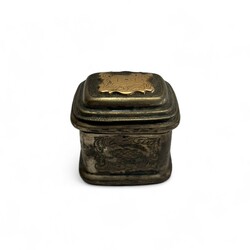 | Omschrijving | Een antiek 19e eeuws tweede gehalte (835/1000) zilveren lodereindoosje, vierkant model, rondom gegraveerd en aan de bovenzijde met een gecontourneerde 14 karaats (585/1000) geelgouden plaquette. Aan de onderzijde met stippelgravure en gemerkt B77 = Brunings, Joure, jaarletter I (1868). |