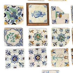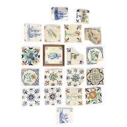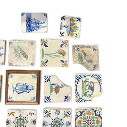| Omschrijving | Lot van 19 17e-eeuwse tegels in diverse condities, met o.a. scheepsmotieven, florale voorstellingen, dieren, landschappen en een enkel fragment in houten lijst. |