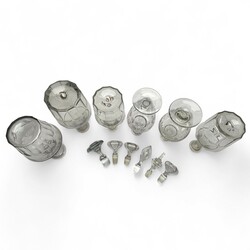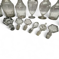 | Conditie | Karaf met olijfslijpsel in goede staat, één karaf met lichte chips bij de voet, van de set van drie één met chip op hals en één met sterbarst, tevens enkele karaffen met aanslag |