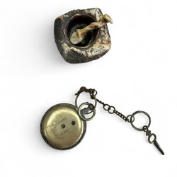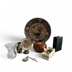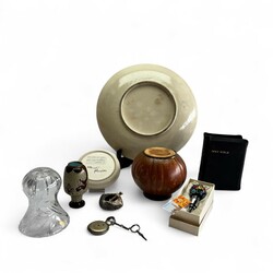 | Omschrijving | Lot diversen, waaronder een Duits jaren ‘30 of ‘40 vaasje, een satsuma wandbord (met chip) en een Murano-stijl glazen flessenstop. |