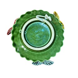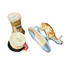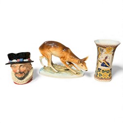 | Omschrijving | Lot divers aardewerk en porselein (5x), bestaande uit een klein majolica wandbord met drie liggende vissen, vermoedelijk Caldas da Rainha, een Bing & Grondahl blauw bord met uil en jaartal 1974, een aardewerken achtkantige kastvaas met voorstelling van Willem V en tekst ‘PVO’ = Prins van Oranje, gemerkt de Claeuw, ca. 1900, een Engelse toby jug, gemerkt Royal Doulton, titel ‘Beefeaters’ en een porseleinen sculptuur van een ree, gemerkt ‘Wanka’, door Royal Dux. |