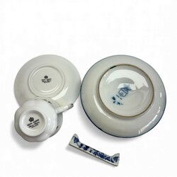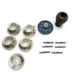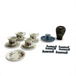 | Omschrijving | Lot divers porselein en aardewerk: een Fries kerfsnee aardewerken vaasje, een blauw-witte Tichelaar blaker, zes porseleinen messenleggers met Zwiebelmuster decor, gemerkt Rauenstein en vier kop en schotels, Royal Albert, decor China Garden. |