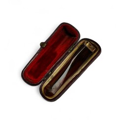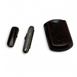 | Omschrijving | Lot divers rookwaar: een lederen sigarenkoker met tekst ‘London Make’, een antiek barnstenen pijpje met 14 karaats rand in foedraal en een blikken doosje. |