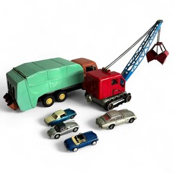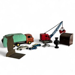 | Omschrijving | Lot divers 20e eeuws speelgoed: een vuilniswagen, met mechanisch beweegbare bak, model ‘Sanitary Service Car’ van Yonezawa, Japan, een gedeeltelijk blikken en kunststof kraan met rupsbanden, Gama, model 280, en vier miniatuur auto’s: drie Corgi (Le Dandy Coupe, MGA 1600 MKI & 007 Aston Martin DB5) en éénmaal New Ray (model MG MGB 1967, schaal 1:43). Met daarbij een boekensteun en een theekistje. |