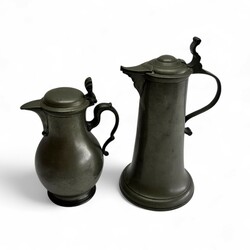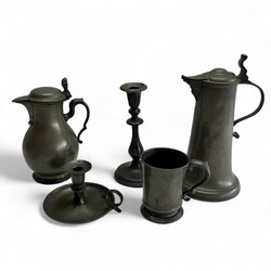 | Omschrijving | Lot met divers tin, waaronder antiek. Bestaande uit een 18e eeuwse Franse wijnkan (Oirschot, blz. 42) en een 18e eeuwse Duitse snavelkan (Oirschot, blz. 40), kroes, kandelaar en een blaker. |