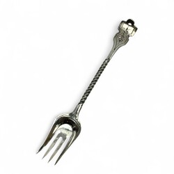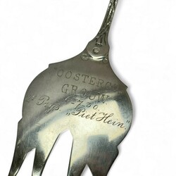 | Omschrijving | Lot divers zilveren schepwerk: een 20e eeuwse tweede gehalte (835/1000) zilveren cakevork, steel bekroond met een bloem, aan de achterzijde met tekst “Oostergo” Grouw 6-7-30 2e Prijs “Piet Hein”. Jaarletter V (1930), meesterteken AxM = mr. A. Meijer, Schoonhoven, twee longdrinklepels met opengewerkte steel, Zaanlandse Zilversmederij, botermesje, Haags Lof, mr. van Kempen, puntfilet vorkje, mr. van Kempen, 1921, en drie antieke vorkjes, gegraveerd en met getorste steel, mr. PCB* = mr. Pieter Coenraad Burghoorn, werkzaam te Schoonhoven 1882 tot 1920. |