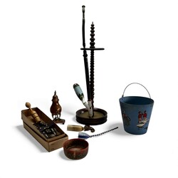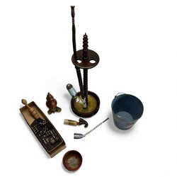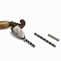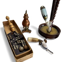 | Omschrijving | Lot diversen: een antiek 19e eeuws mahoniehouten gedraaid pijpenstander met antieke pijp, één Fries aardewerken pijp met opschrift ‘J. Wiemenga’ en datering 1884, een 20e eeuwse miniatuur koperen kraankan, klein houten nap, een vroeg 20e eeuws houten emmertje met voorstelling van figuren in klederdracht en opschrift ‘Scheveningen’ en een set antieke dominostenen. |
