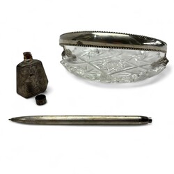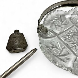 | Omschrijving | Lot diversen: een kristallen schaaltje met divers slijpsel en tweede gehalte (835/1000) zilveren beugel, versierd met parelrand, gekeurd mr. H3B = J.J. Bolhuis & H. Höhle, werkzaam te Amsterdam van 1905 tot 1922, jaarletter A (1910), een 20e eeuwse eerste gehalte (925/1000) zilveren balpen, een parfumflacon in tweede gehalte (835/1000) zilveren montuur en twee kristallen coupes, model ‘Omar’, ontwerp W.J. Rozendaal voor Kristalunie, 1931. |