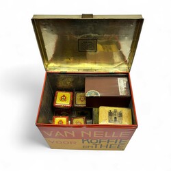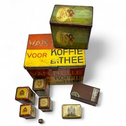 | Omschrijving | Lot met acht diverse formaten blikken oa Droste, waaronder een miniatuur monsterblikje, Van Slooten, Harlingen pepermunt en een Van Nelle Koffie en Thee blik naar een ontwerp van Jac Jongert. |