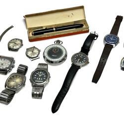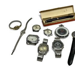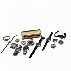 | Omschrijving | Een lot met diverse horloges, diverse merken en modellen. Hierbij een Mali-Swiss stopwatch en een Osmia vulpen in origineel doosje. |