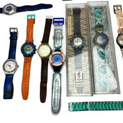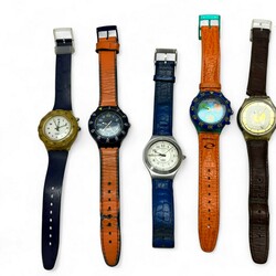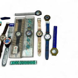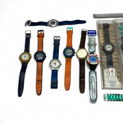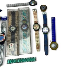 | Omschrijving | Lot met Swatch horloges, waarvan twee in doos. Heren modellen. Diverse jaren en oa Scuba uitvoeringen en een automaat. Werking onbekend. |