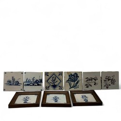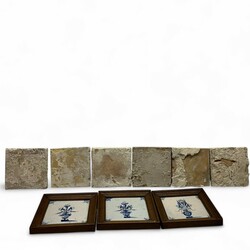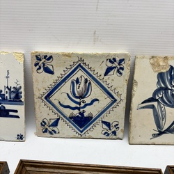 | Omschrijving | Lot diverse 17e en 18e eeuwse tegels, blauw-wit en mangaan, waaronder een 17e eeuwse tulpentegel met Franse Lelie hoekmotief. |