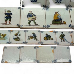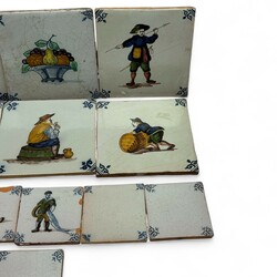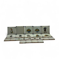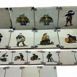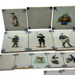 | Omschrijving | Lot 20e eeuwse tegels, Tichelaar Makkum. Voornamelijk polychroom gedecoreerd met beroepen & spinnekop hoekmotief. |
