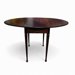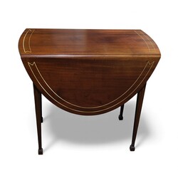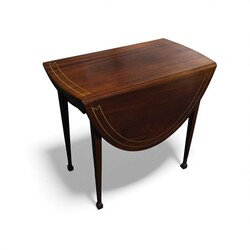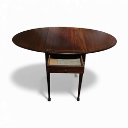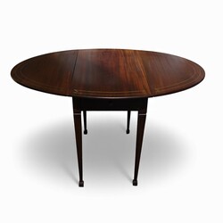 | Omschrijving | Een 20e eeuwse mahoniehouten tafel met twee flappen, blad ingelegd met messing bies. |