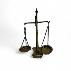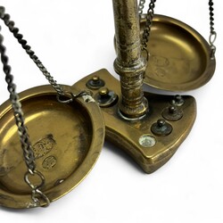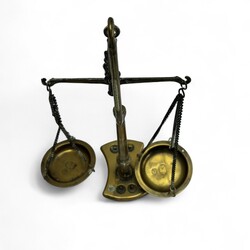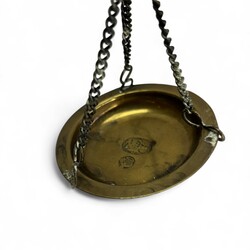 | Omschrijving | Een 20e eeuwse messing balans, naar antiek voorbeeld. Met zes gewichtjes, de schaaltjes gemerkt met het stadskeur van Amsterdam en een kroontje. |