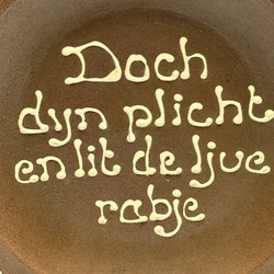 | Omschrijving | Een bruin aardewerken spreukschotel, in ringeloor techniek. "Doch dyn plicht en lit de ljue rabje". Gemerkt Mobach, Utrecht. Ca 1905. Uit de collectie Meentwijck. |