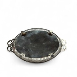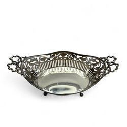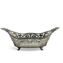 | Omschrijving | Ovale zilveren broodmand met strikjes versierd en geplaatst op vier ...en .... |