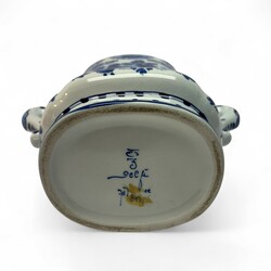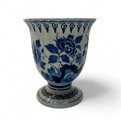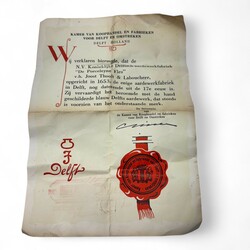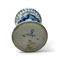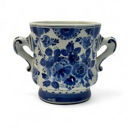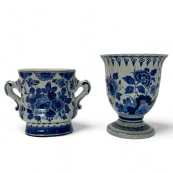 | Omschrijving | Lot van twee stuks aardewerk, Porceleyne Fles: één tweeorenvaas, beschilderd met floraal decor, en één ronde, geschulpte vaas met decor van bloemen en vogels. Beide met certificaat. |