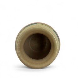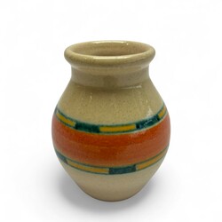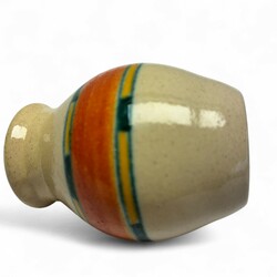 | Omschrijving | Potterie Kennemerland,Velzen platelen blokjes vaas. Model nr 28. Groen, geel en oranje op een creme kleurige fond.. Ca 1930. |