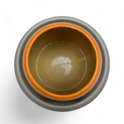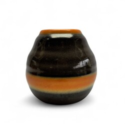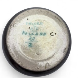 | Omschrijving | Potterie Kennemerland, Velzen platelen vaas. Model nr 29. Bruin met oranje banen. Ca 1930. |
