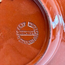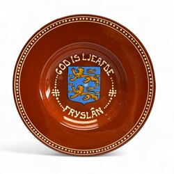 | Omschrijving | Een aardewerken spreukschotel in het bruin in ringeloor techniek : Met spreuk "God is Leafde, Fryslan " en het wapen van Friesland. Schotels is gemerkt, voor de potterij Rembrandt, Nijmegen. ca 1915. |