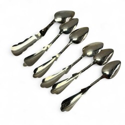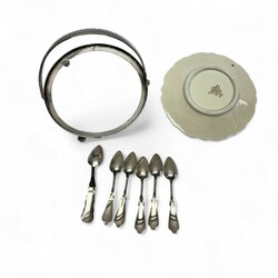| Omschrijving | Lot diversen een Duits porseleinen schaaltje in tweede gehalte (835/1000) zilveren montuur, met hengsel, mogelijk niet bijpassend. Met daarbij zes antieke 19e eeuwse tweede gehalte (835/1000) zilveren advocaatlepeltjes |