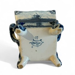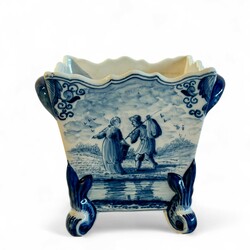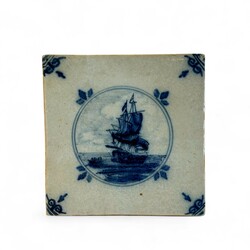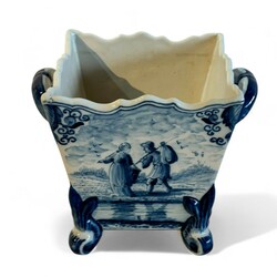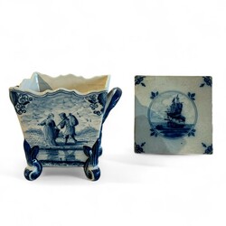 | Omschrijving | Lot van twee stuks aardewerk: een 20e eeuws blauw-wit gedecoreerd bloempotje met twee grepen, gedecoreerd met voorstelling van figuren en een molen. aan de onderzijde gemerkt Tichelaar, Makkum. Met daarbij een 20e eeuwse blauw-witte tegel, voorstelling van schip in medaillon en spinnekop hoekmotief. |