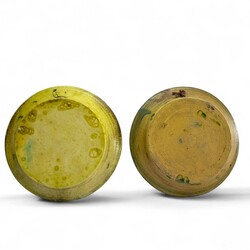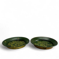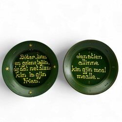 | Omschrijving | Twee aardewerken spreukschotels in het groen in ringeloor techniek : Met spreuk "Den stien allinne kin gjin moal mealle en Buter brea en griene tsjiis dij dat net sizze kin is gjin Fries. " Beide schotels niet gemerkt, maar toegeschreven aan potterij Rembrandt. ca 1910. |