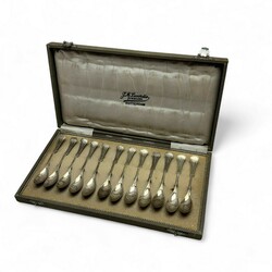 | Omschrijving | Een cassette gevuld met twaalf vroeg 20e eeuwse tweede gehalte (835/1000) zilveren theelepels, gedeeltelijk gehamerd, Amsterdamse School stijl. Gemerkt met zwaardje en ‘HH’ = Hendrik Hooykaas. In cassette van J.M. Lucardie, Rotterdam. |