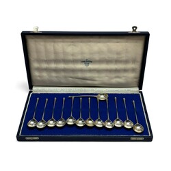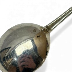 | Omschrijving | Een 20e eeuwse cassette gevuld met twaalf tweede gehalte (835/10000) zilveren lepeltjes en een suikerschepje, bekroond met eikeltje. Gekeurd met zwaardje en meesterteken B2V* = Bijkamp & Co. c.v., Steenwijk, periode 1946-1975. |