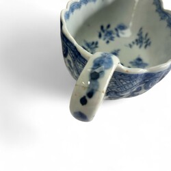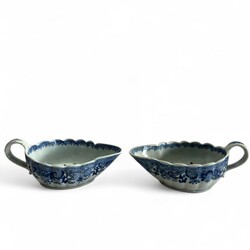 | Omschrijving | Twee blauw-witte 18e-eeuwse porseleinen sauskommen met gelobde rand en florale decoraties, elk met oor. |