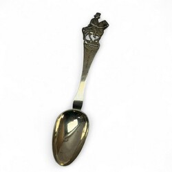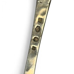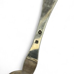 | Omschrijving | Lot van twee antieke 19e eeuwse tweede gehalte (835/1000) zilveren geboortelepels, met gegraveerde steel. Eén bekroond met ruiter te paard, mr. W69 = Johannes Livius Wartna, werkzaam te Bolsward (1876-1892), jaarletter U (1879), met inscriptie ‘Johanna H. v.d. Vleugel is geboren 18 april 1879 en is overleden 31 maart 1881’. De andere bekroond met de Republiek, mr. RF = J. Rudolphus Feenstra, werkzaam te Sneek, jaarletter H (=1817), met (mogelijk latere) inscriptie ‘ter herinnering aan ‘t huwelijk van Hartha Santema’. |