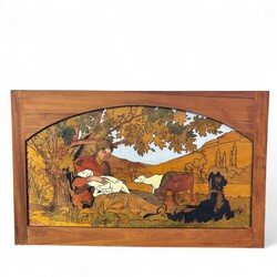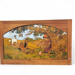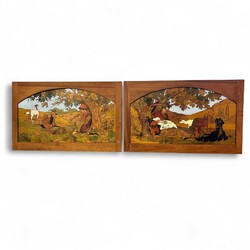 | Omschrijving | Lot van twee vroeg 20e eeuwse bewerkte houten panelen met voorstellingen van herders met dieren. |