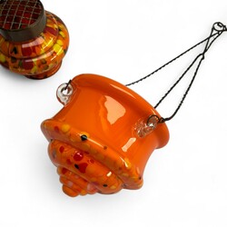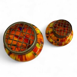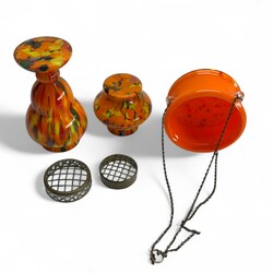 | Omschrijving | Lot van twee jaren '30 oranje Boheems glazen vazen, vermoedelijk Antonin Ruckl voor Kralik. Met daarbij een hangende bloempot, tevens oranje met gekleurde accenten. |