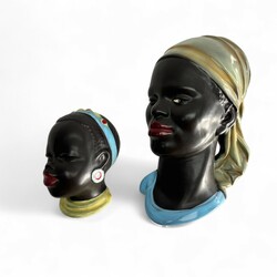 | Omschrijving | Lot van twee 20e eeuwse geglazuurde keramieken wandmaskers, voorstelling van Afrikaanse vrouw en Afrikaans kind. Gemerkt met serienummers ‘3432’ en ‘1110’, beide gemerkt ‘made in Western Germany’. Gemaakt bij Cortendorf, jaren ‘50 |