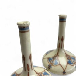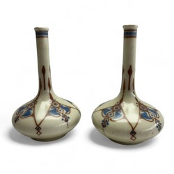 | Omschrijving | Een passend stel platelen pijpvaasjes. Met een blauw/ bruin geometrische decor naar en ontwerp van Chris van der Hoef. Gemerkt voor de plateelfabriek de Distel, Amsterdam, ca 1915. |