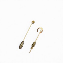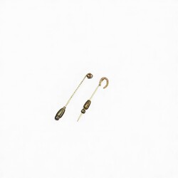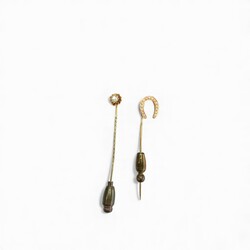 | Omschrijving | Lot van twee 14 karaats (585/1000) geelgouden dasspelden, één bezet met diamant, één in de vorm van een hoefijzer, bezet met zaadparel. |